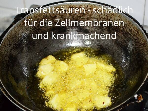 Entstehung von Transfettsäuren: Darüber hinaus können sich der Vitamingehalt von Ölen und Fetten beim Erhitzen verringern und die Fettsäuren verändern. So entstehen beim Erhitzen von Ölen und Fetten, die ungesättigte Fettsäuren enthalten, ab einer Temperatur von 130 °C sogenannte trans-Fettsäuren und dies umso mehr, je höher die Temperaturen und der Gehalt an mehrfach ungesättigten Fettsäuren in den Ölen und Fetten sind.