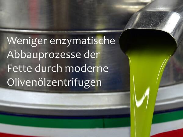Dadurch werden die Fette, die aus Glycerin und drei Fettsäuren bestehen, in Glycerin und Fettsäuren (= freie Fettsäuren) aufgespalten. Gesunde, unverletzte Oliven enthalten keine freien Fettsäuren. - Durch oxidative Prozesse: Zum anderen entstehen freie Fettsäuren in Olivenöl und allen anderen pflanzlichen Ölen auch durch oxidative Prozesse, insbesondere durch eine Oxidation des Öls mit dem Luftsauerstoff und durch mögliche Licht- und Wärmeeinwirkungen. Dadurch werden die Fettsäuren ebenfalls vom Glycerin abgetrennt.