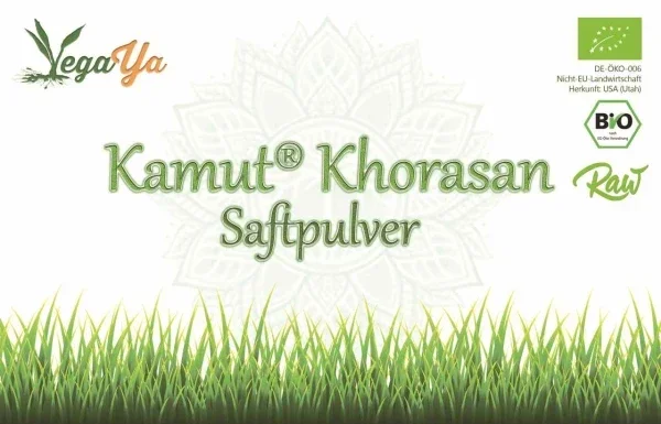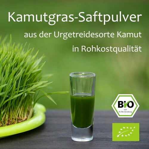Bei Kamut handelt es sich um eine Markenbezeichnung für die Urweizensorte Khorasan, dessen besonderen Eigenschaften sich auch im Grassaft widerspiegeln.